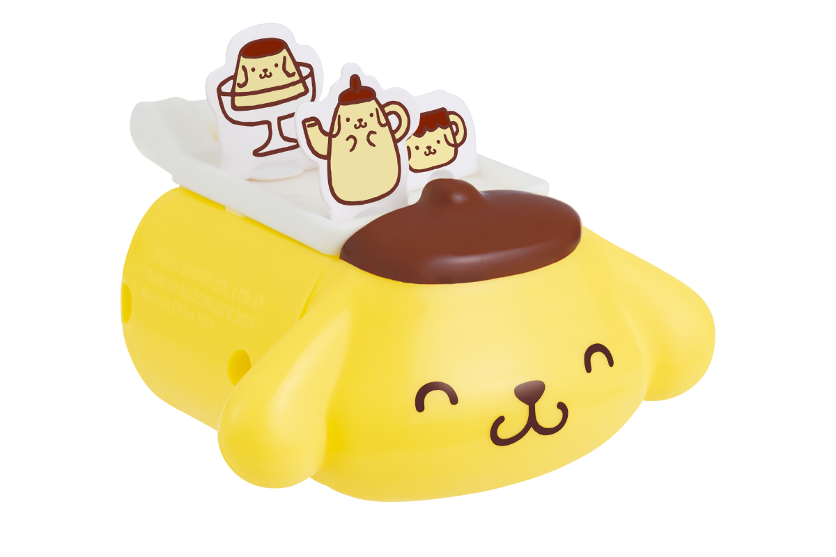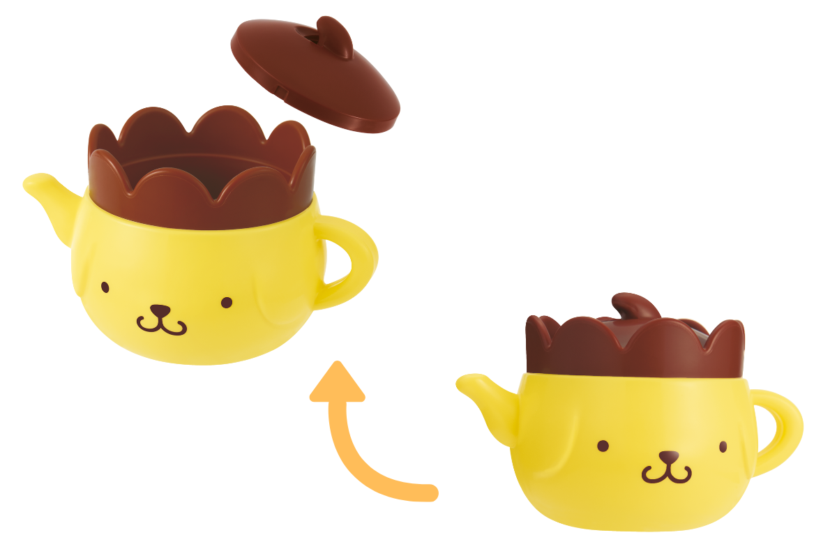 ポムポムプリンのティーポット型のおもちゃ。帽子が蓋になっています。中には何を収納しようかな? 小物を整理しながら、お片付けが楽しくなりそう!
