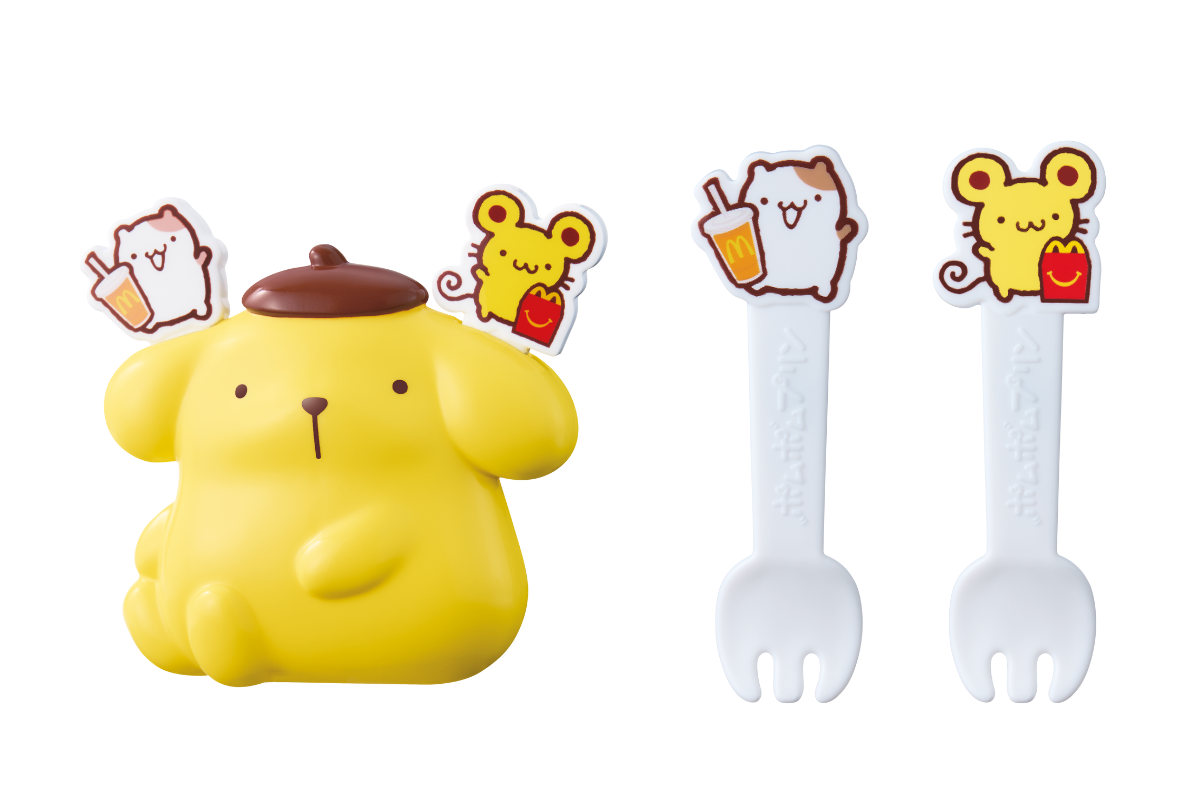 ポムポムプリンの両サイドに、お友だちの“マフィン”と“スコーン”がちょこんと登場♪ ケースをあけるとフォークが2本入っています。