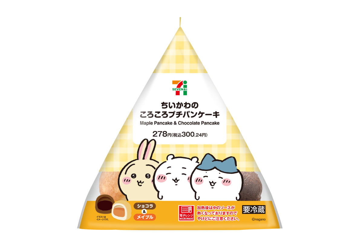 ちいかわとうさぎが食べていた巨大なホットケーキをイメージしたパンケーキ。ショコラとメイプルの2つの味が楽しめる、食べやすいサイズにした商品です。