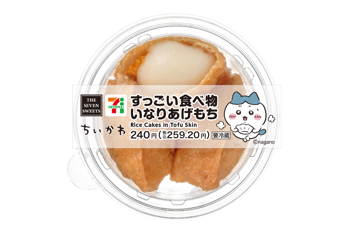 ハチワレがちいかわに「共有」したかった、すっごい食べ物の「いなりあげもち」をイメージ。甘辛く煮た油揚げでコシのあるおもちが包まれています。