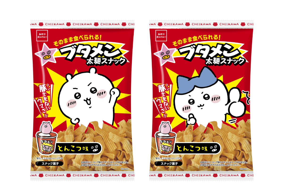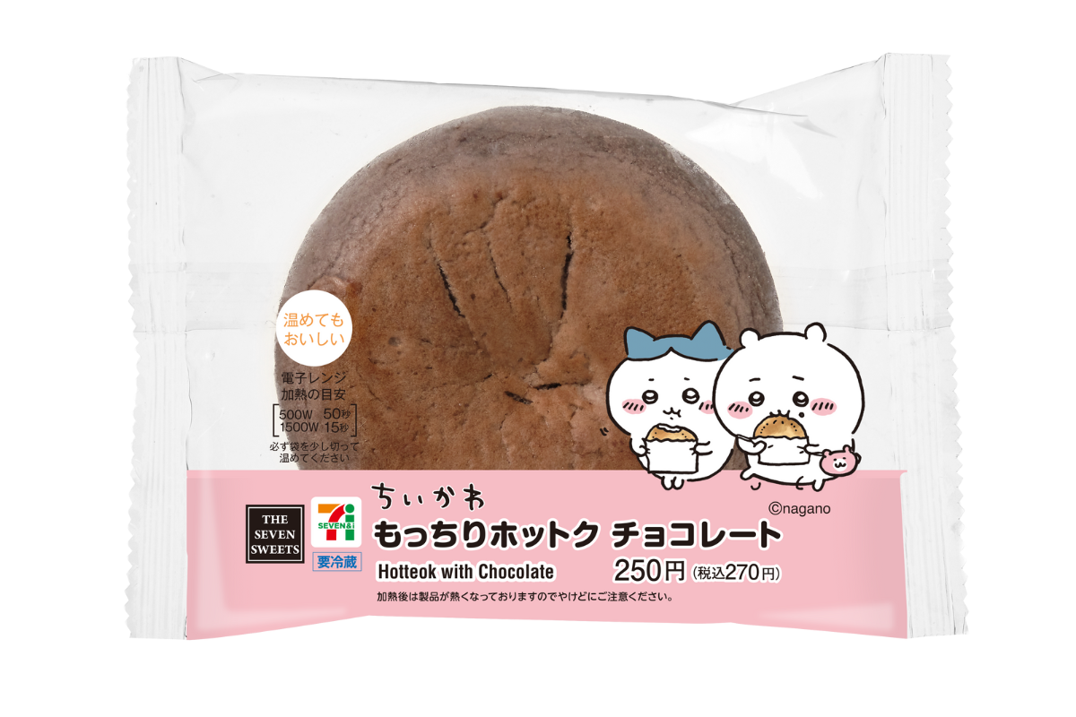 ちいかわとリボンをなくしたハチワレが食べていたおやきをイメージした商品。ビターな味わいのチョコレートが入ったもちもち食感のホットクです。