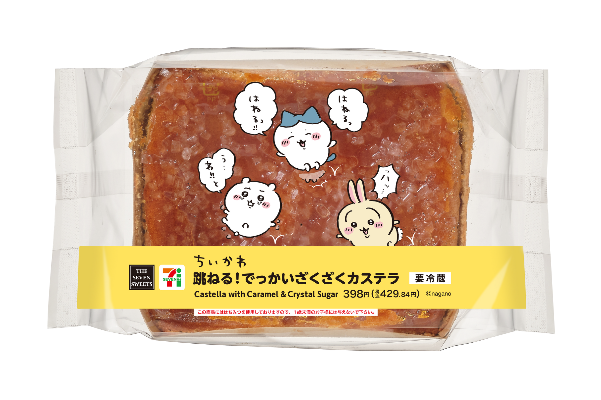 ちいかわたちが飛び跳ねていたザラメ付きカステラをイメージした商品。ザラメのざくざくとした食感と、しっとりとした生地のコントラストが楽しい!