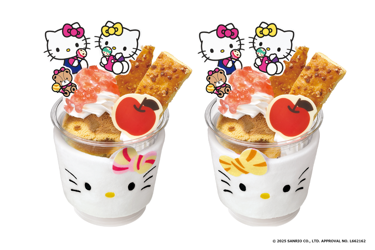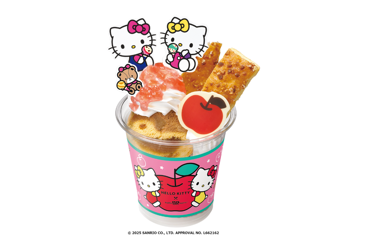 お好きなスモールサイズのアイスクリーム2コに、ホイップクリームと角切りリンゴ入りのリンゴソースをかけ、発酵バターの香りとアーモンドの香ばしさが楽しめます。サクサク食感のパイとリンゴ型チョコレートがトッピングされています。ハローキティ、ハローミミィ、タイニーチャムのピックもついて、とってもキュート!