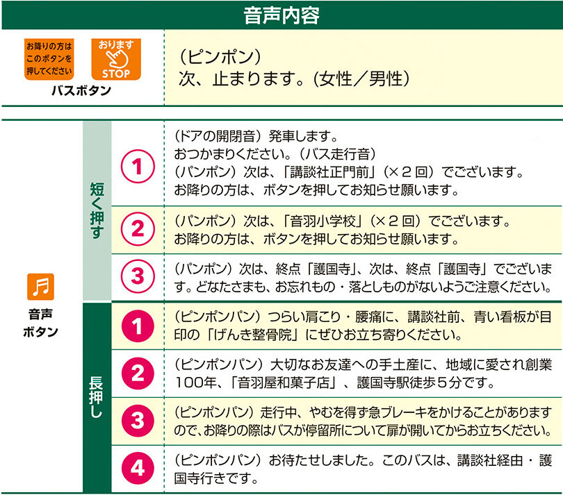 「つぎ、止まります」、「発車します。おつかまりください」など、実際のバスを思わせるアナウンスが複数収録されています。