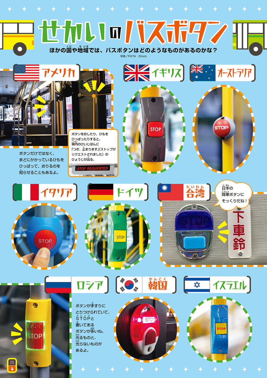 ムック本には、「バスボタンのしくみ」「運転士さんのお仕事」「車内の設備」「世界のバスボタン」など、普段は見られないバスにまつわる情報が満載です。