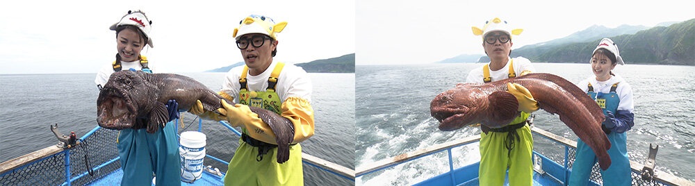 北海道知床沖で、「北の海の神さま」とされるオオカミウオちゃんを釣り上げたのが思い出深いですね。オオカミウオちゃんはめったに釣れないお魚だそうで、船長さんから何年も通っているのに釣れない方もいると聞いていたんです。どうなることか心配していたら、な、なんとシャーク香音さまもさかなクンも1ぴきずつオオカミウオちゃんを釣り上げることができたのです。大自然が広がる知床の海で、迫力いっぱいのオオカミウオちゃんとの奇跡のような出会いでしたね!