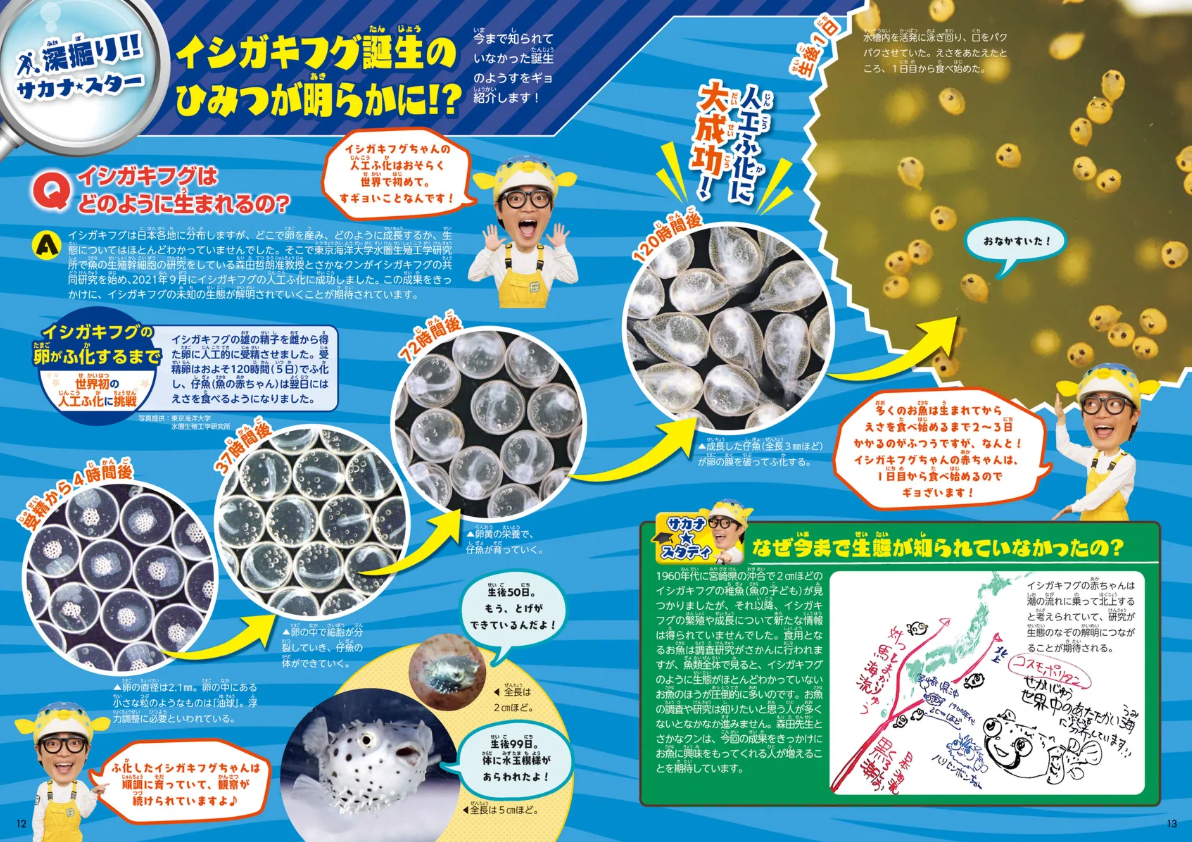 どのお魚もギョりっぱなサカナ★スターなのですが、レギュラー放送初回のイシガキフグちゃんは大好きなお魚であり、とくに印象に残っています! かつてイシガキフグちゃんは、生まれてから20cmくらいの大きさになるまでの姿や生態がほとんどわかっていなかったんです。そこで、さかなクンから東京海洋大学の森田哲朗先生にギョ提案して、2021年から共同研究(※1)をおこないました。その結果、イシガキフグちゃんが卵から産まれてどのように成長していくかを知ることができたんです!