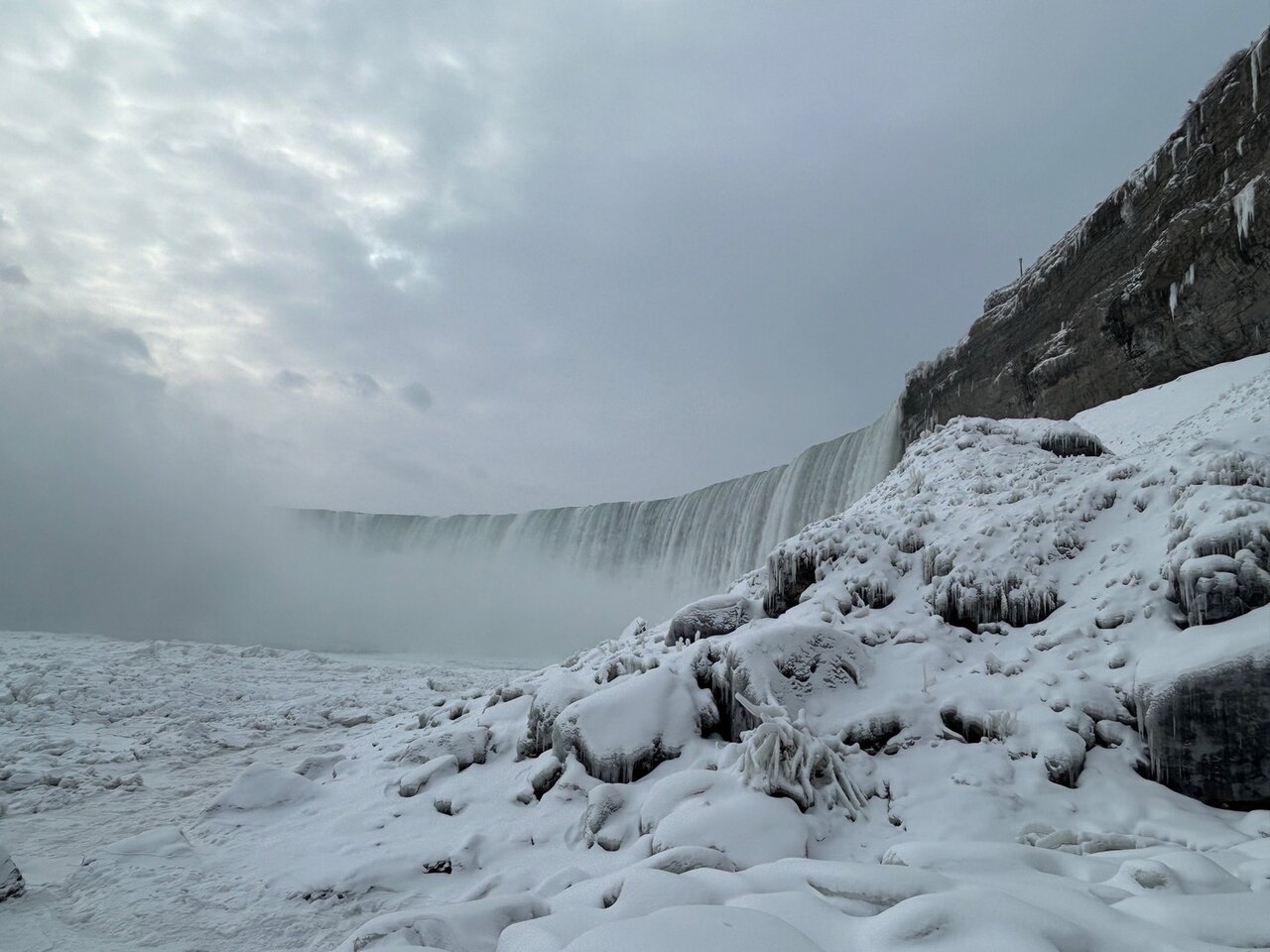 寒すぎて水飛沫があちこちで凍っていて、滝の水の量も多く、ものすごい音がしていましたが、とても綺麗で神秘的でした。