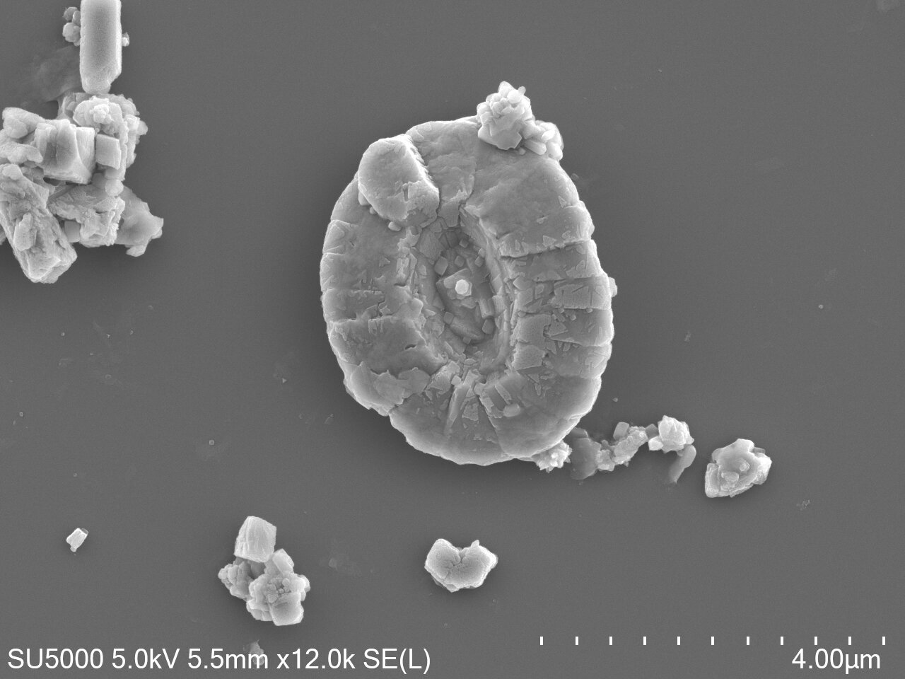 石灰岩に含まれていた円石藻化石の電子顕微鏡写真(宇都宮正志さん撮影)