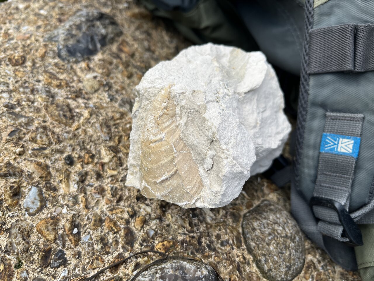 地層から落ちてビーチにゴロゴロ転がっている岩石のブロックをハンマーで叩いて割ってみます。チョーク質の石灰岩は、思っていたよりは硬く、でも力いっぱいハンマーを当てると簡単に割れるくらいには柔らかい、化石探しにはちょうど良い硬さの岩石でした。
