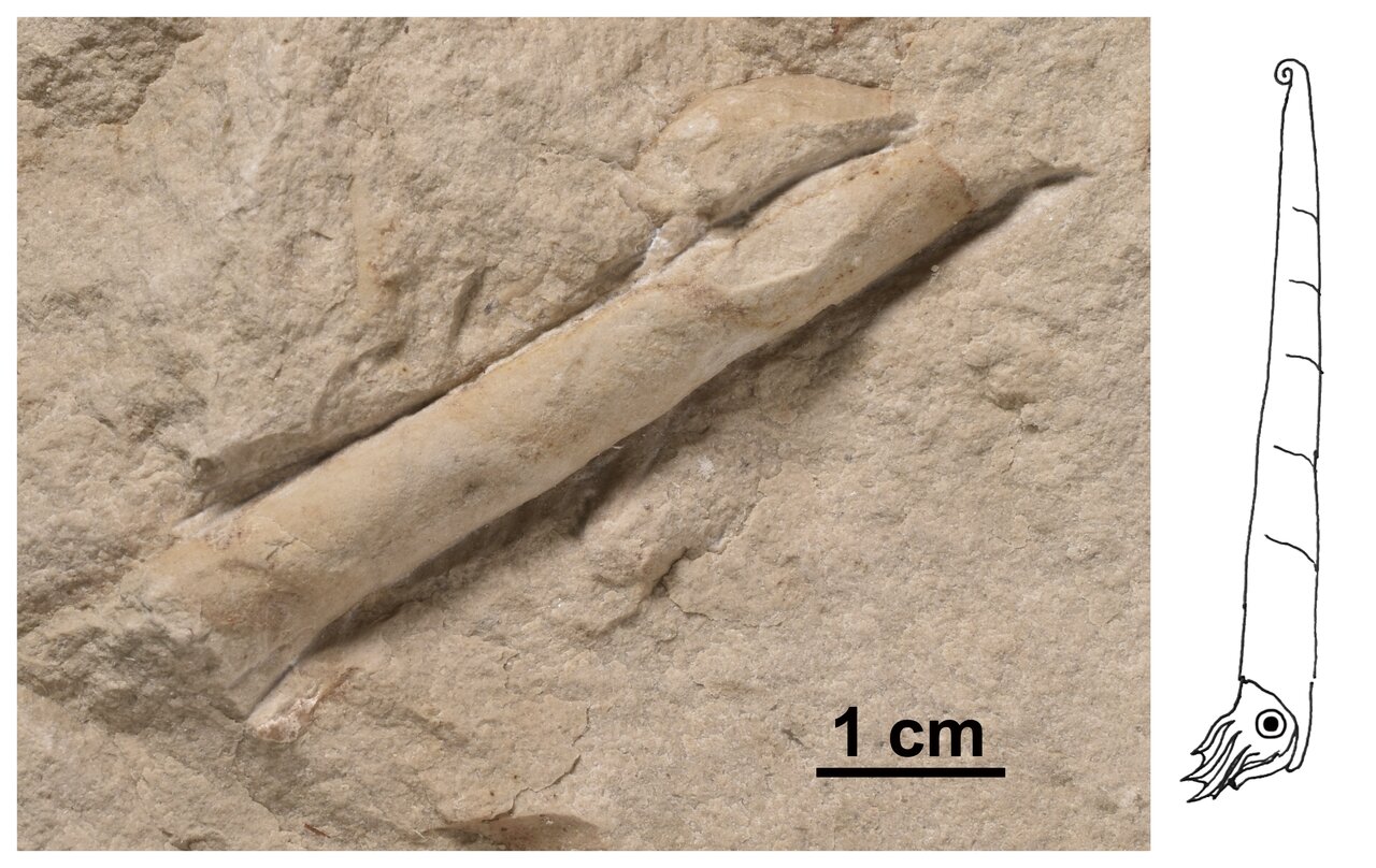 異常巻アンモナイト「スキポノセラス」の化石と生体復元図