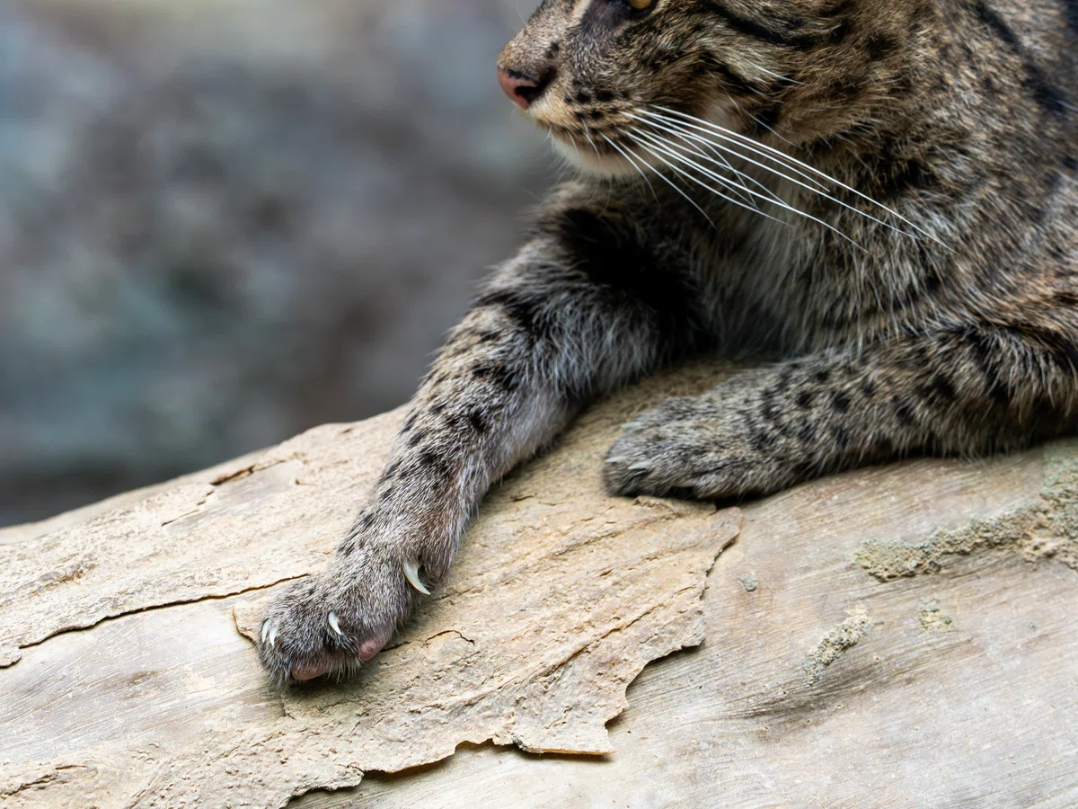 爪がみえるスナドリネコの脚。ネコ科のほとんどは爪をしまうことができますが、スナドリネコは完全にしまいません。これは滑りやすい水辺を歩くための適応です。