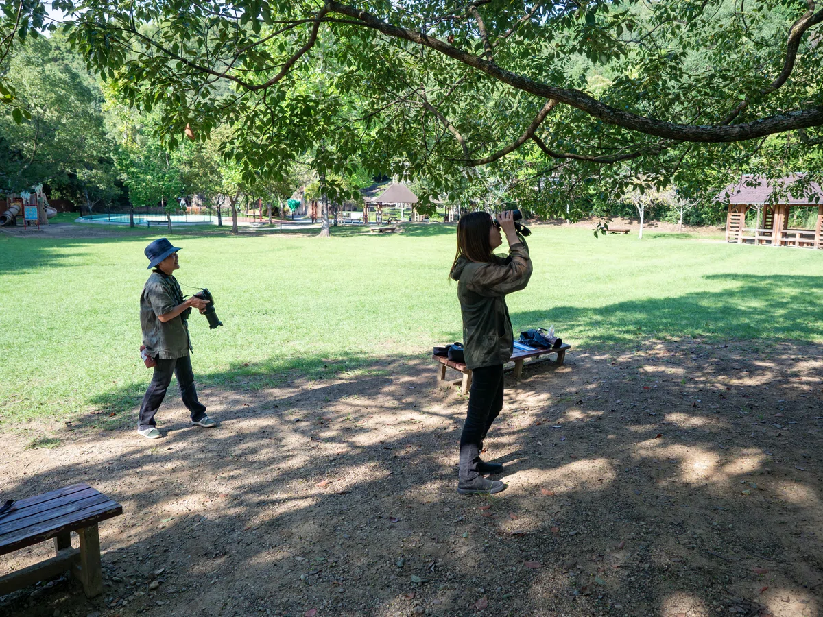 空が広く見える場所で、飛んでいくタカを双眼鏡で確認します。