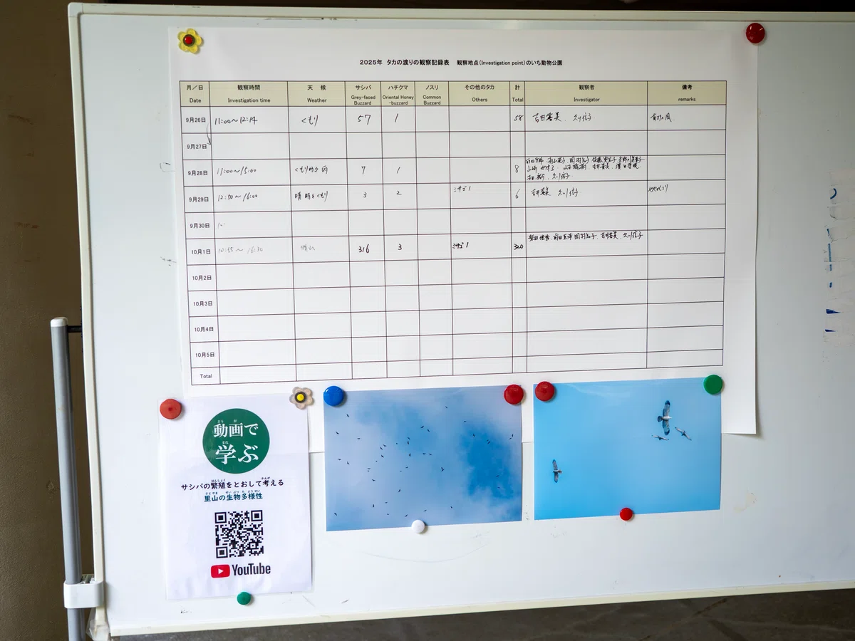 取材した10月初旬は、サシバというタカが越冬地へ移動するピークの時期で、この動物公園はその渡りルート上にあります。園では、職員さんや常連の来園者の方々と一緒に、通過するタカの数を毎日数えたり、「タカの渡り観察会」を開催したりしているそうです。