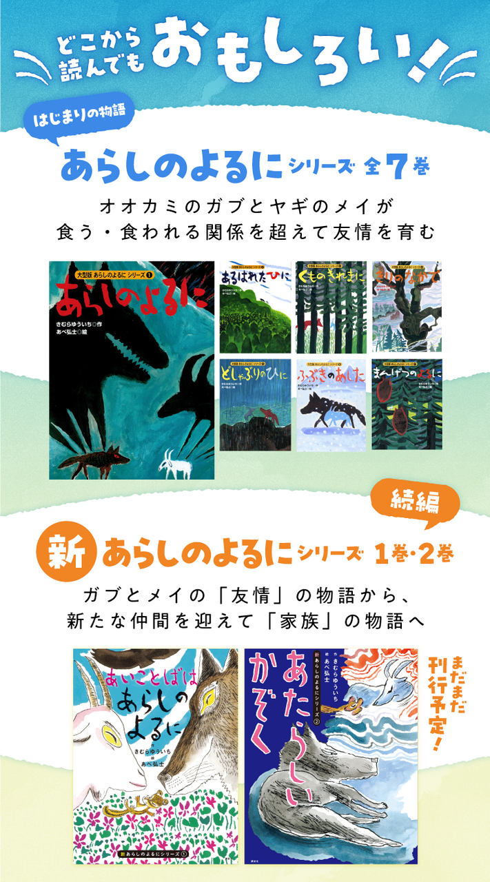 新シリーズ1作目は『新あらしのよるにシリーズ1 あいことばはあらしのよるに』。ひみつのともだちになったオオカミのガブとヤギのメイが、新しい家族に出会うお話です。
