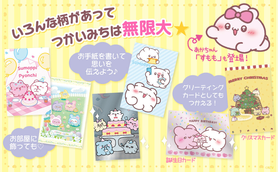 えほんに、3種類のすもっぴダイアリーポストカードのどれかひとつが入っているよ! すもっぴの一日をのぞいちゃおう。