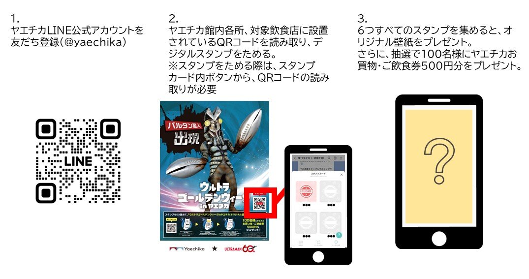 ヤエチカ館内各所、対象飲食店にQRコードを設置。LINE内で6つすべてのデジタルスタンプを集めると、「ウルトラゴールデンウィーク in ヤエチカ オリジナル壁紙」をプレゼント!