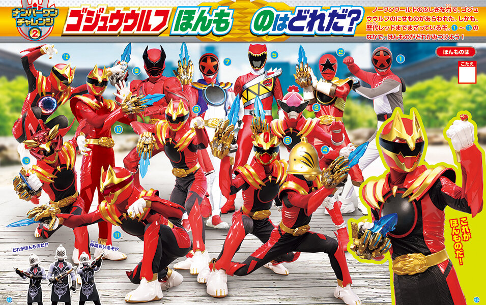 ノーワンワールドのふしぎな力でゴジュウウルフのにせ者が出現! 歴代レッドもまざったなかから、本物のゴジュウウルフをみつけられるかな?